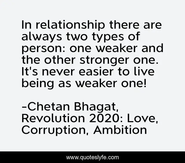 This page presents the quote "In relationship there are always two types of person: one weaker and the other stronger one. It's never easier to live being as weaker one!". Author of this quote is Chetan Bhagat, Revolution 2020: Love, Corruption, Ambition. .