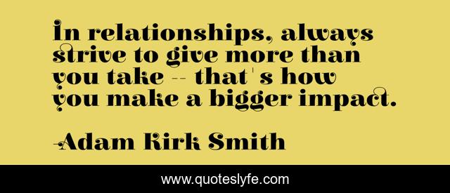 This page presents the quote "In relationships, always strive to give more than you take -- that's how you make a bigger impact.". Author of this quote is Adam Kirk Smith. This quote is about impact, relationships, influence, people,.
