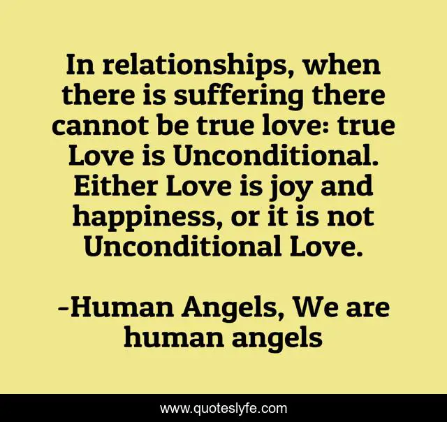 This page presents the quote "In relationships, when there is suffering there cannot be true love: true Love is Unconditional. Either Love is joy and happiness, or it is not Unconditional Love.". Author of this quote is Human Angels, We are human angels. This quote is about relationships, relationship, oneness, unconditional-love, angels, happiness,.