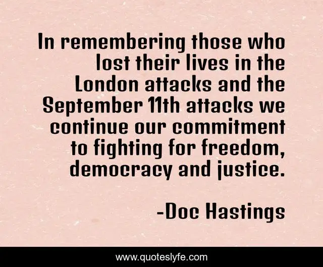 This page presents the quote "In remembering those who lost their lives in the London attacks and the September 11th attacks we continue our commitment to fighting for freedom, democracy and justice.". Author of this quote is Doc Hastings. This quote is about justice, freedom, commitment,.