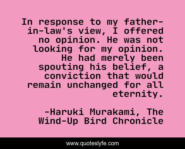 This page presents the quote "In response to my father-in-law's view, I offered no opinion. He was not looking for my opinion. He had merely been spouting his belief, a conviction that would remain unchanged for all eternity.". Author of this quote is Haruki Murakami, The Wind-Up Bird Chronicle. This quote is about opinions, convictions, beliefs,.