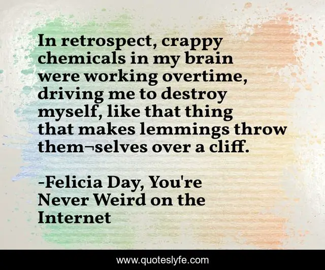 This page presents the quote "In retrospect, crappy chemicals in my brain were working overtime, driving me to destroy myself, like that thing that makes lemmings throw them¬selves over a cliff.". Author of this quote is Felicia Day, You're Never Weird on the Internet. This quote is about felicia-day, brain, depression, mental-illness, self-destruction,.