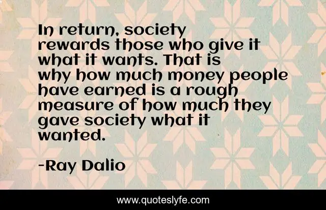 This page presents the quote "In return, society rewards those who give it what it wants. That is why how much money people have earned is a rough measure of how much they gave society what it wanted.". Author of this quote is Ray Dalio. This quote is about money, why, people,.