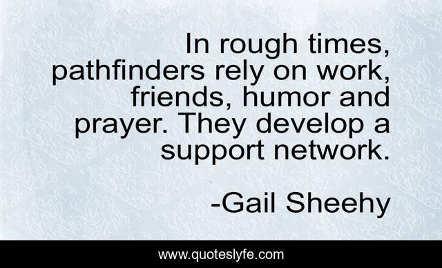 This page presents the quote "In rough times, pathfinders rely on work, friends, humor and prayer. They develop a support network.". Author of this quote is Gail Sheehy. This quote is about support, work, friends,.