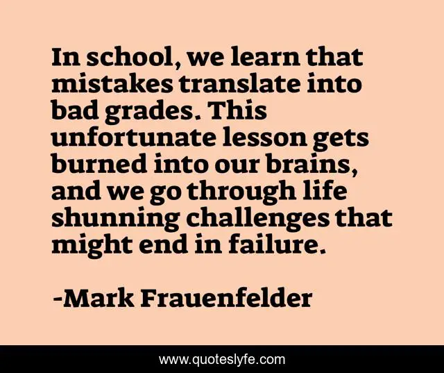 This page presents the quote "In school, we learn that mistakes translate into bad grades. This unfortunate lesson gets burned into our brains, and we go through life shunning challenges that might end in failure.". Author of this quote is Mark Frauenfelder. This quote is about life, mistakes, school,.