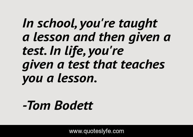 This page presents the quote "In school, you're taught a lesson and then given a test. In life, you're given a test that teaches you a lesson.". Author of this quote is Tom Bodett. This quote is about test, school,.