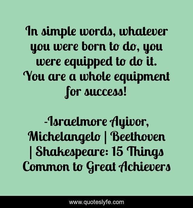 This page presents the quote "In simple words, whatever you were born to do, you were equipped to do it. You are a whole equipment for success!". Author of this quote is Israelmore Ayivor, Michelangelo | Beethoven | Shakespeare: 15 Things Common to Great Achievers. This quote is about food-for-thought, birth, success, equipment, simple, simple-words, born, words, equip,.