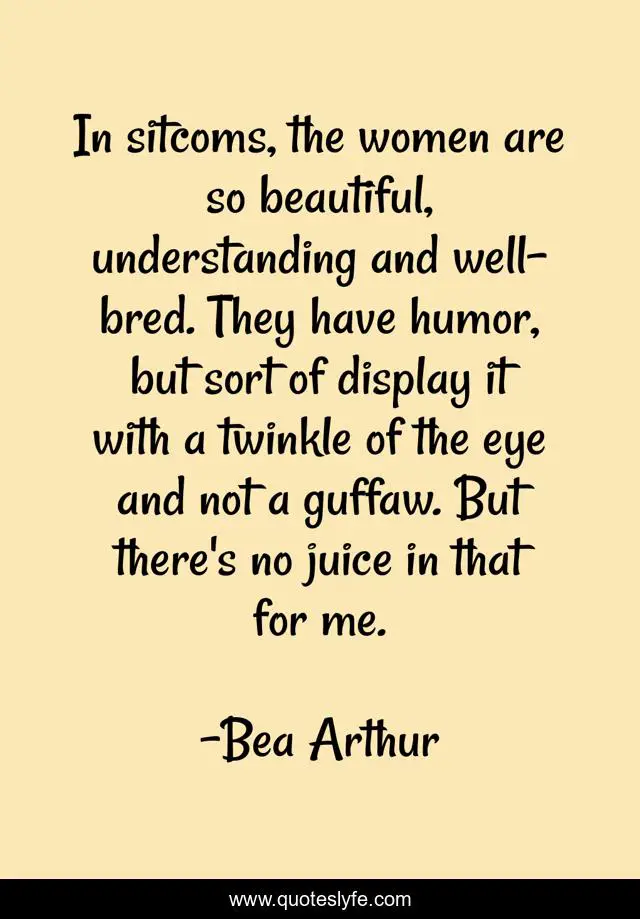 This page presents the quote "In sitcoms, the women are so beautiful, understanding and well-bred. They have humor, but sort of display it with a twinkle of the eye and not a guffaw. But there's no juice in that for me.". Author of this quote is Bea Arthur. This quote is about beautiful, me, women,.