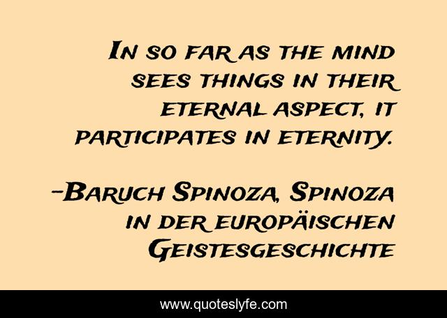 This page presents the quote "In so far as the mind sees things in their eternal aspect, it participates in eternity.". Author of this quote is Baruch Spinoza, Spinoza in der europäischen Geistesgeschichte. This quote is about genius, aesthetics,.
