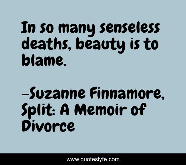 This page presents the quote "In so many senseless deaths, beauty is to blame.". Author of this quote is Suzanne Finnamore, Split: A Memoir of Divorce. This quote is about infidelity, death, beauty, divorce, seperation, marriage,.