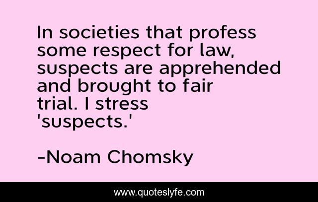 This page presents the quote "In societies that profess some respect for law, suspects are apprehended and brought to fair trial. I stress 'suspects.'". Author of this quote is Noam Chomsky. This quote is about stress, law, fair,.