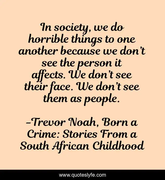 This page presents the quote "In society, we do horrible things to one another because we don’t see the person it affects. We don’t see their face. We don’t see them as people.". Author of this quote is Trevor Noah, Born a Crime: Stories From a South African Childhood. This quote is about crime, injustice, cruelty,.