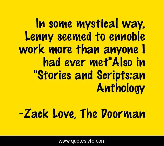 This page presents the quote "In some mystical way, Lenny seemed to ennoble work more than anyone I had ever met"Also in "Stories and Scripts:an Anthology". Author of this quote is Zack Love, The Doorman. This quote is about faith, admiration, contemplation, fate, lenny, alex-becker, zack-love, attitude-in-life, life-lessons,.