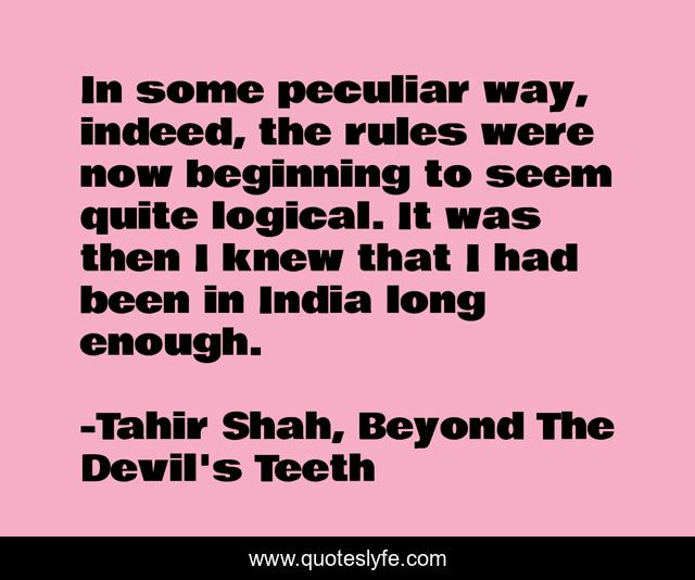 This page presents the quote "In some peculiar way, indeed, the rules were now beginning to seem quite logical. It was then I knew that I had been in India long enough.". Author of this quote is Tahir Shah, Beyond The Devil's Teeth. This quote is about rules, culture, travel, india, logic,.