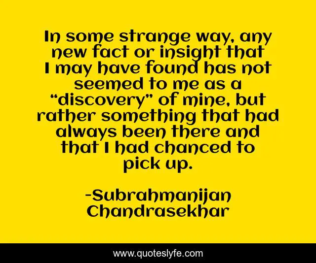 This page presents the quote "In some strange way, any new fact or insight that I may have found has not seemed to me as a “discovery” of mine, but rather something that had always been there and that I had chanced to pick up.". Author of this quote is Subrahmanijan Chandrasekhar. This quote is about information, nobel-laureate, knowledge, lost, science, insight, scientific-discovery, scientist, strange,.