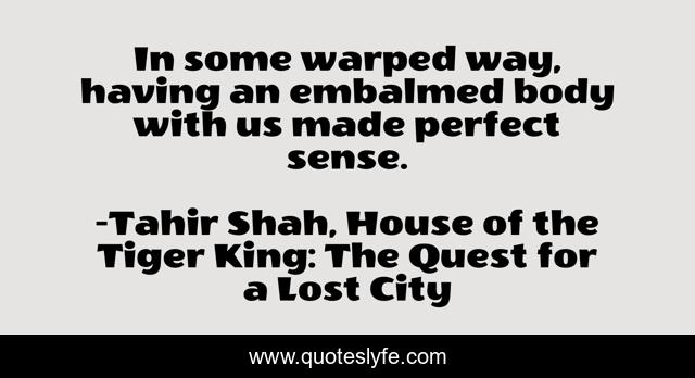 This page presents the quote "In some warped way, having an embalmed body with us made perfect sense.". Author of this quote is Tahir Shah, House of the Tiger King: The Quest for a Lost City. This quote is about body, mummy, corpse, quest, adventure,.
