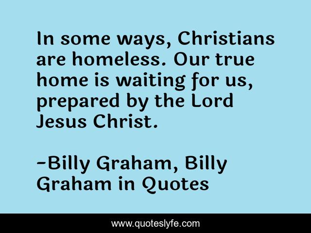 This page presents the quote "In some ways, Christians are homeless. Our true home is waiting for us, prepared by the Lord Jesus Christ.". Author of this quote is Billy Graham, Billy Graham in Quotes. This quote is about home, billy-graham,.