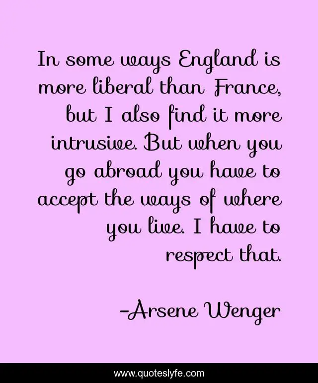 This page presents the quote "In some ways England is more liberal than France, but I also find it more intrusive. But when you go abroad you have to accept the ways of where you live. I have to respect that.". Author of this quote is Arsene Wenger. This quote is about live, find,.