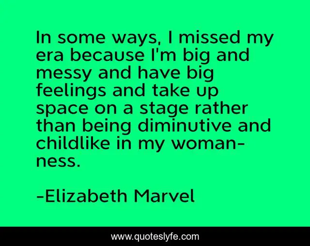 This page presents the quote "In some ways, I missed my era because I'm big and messy and have big feelings and take up space on a stage rather than being diminutive and childlike in my woman-ness.". Author of this quote is Elizabeth Marvel. This quote is about messy, up, feelings,.