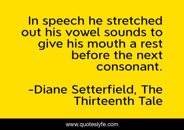 This page presents the quote "In speech he stretched out his vowel sounds to give his mouth a rest before the next consonant.". Author of this quote is Diane Setterfield, The Thirteenth Tale. .