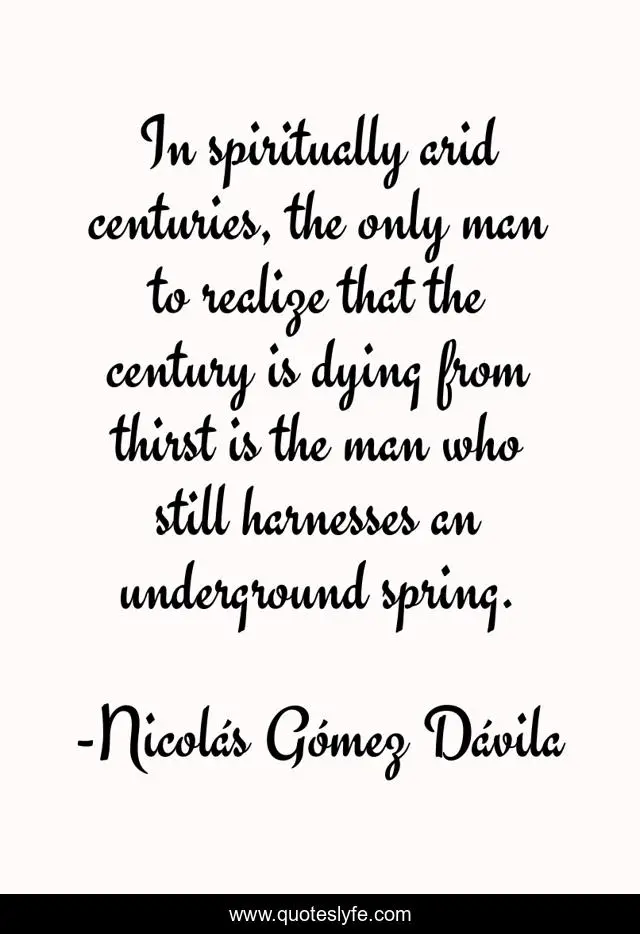 This page presents the quote "In spiritually arid centuries, the only man to realize that the century is dying from thirst is the man who still harnesses an underground spring.". Author of this quote is Nicolás Gómez Dávila. .