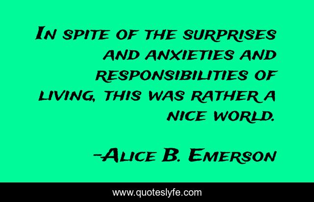 This page presents the quote "In spite of the surprises and anxieties and responsibilities of living, this was rather a nice world.". Author of this quote is Alice B. Emerson. This quote is about world, happiness, hope, happy,.