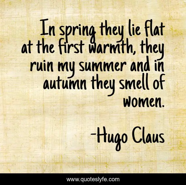 This page presents the quote "In spring they lie flat at the first warmth, they ruin my summer and in autumn they smell of women.". Author of this quote is Hugo Claus. This quote is about autumn, lie, spring,.