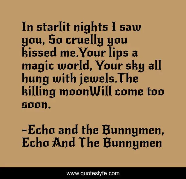 This page presents the quote "In starlit nights I saw you, So cruelly you kissed me.Your lips a magic world, Your sky all hung with jewels.The killing moonWill come too soon.". Author of this quote is Echo and the Bunnymen, Echo And The Bunnymen. This quote is about love, lyrics, ambivalence, moon, romance, gothic, music, affection,.