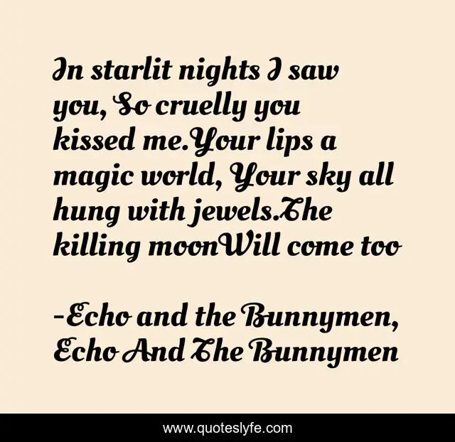 This page presents the quote "In starlit nights I saw you, So cruelly you kissed me.Your lips a magic world, Your sky all hung with jewels.The killing moonWill come too". Author of this quote is Echo and the Bunnymen, Echo And The Bunnymen. This quote is about love, lyrics, ambivalence, moon, romance, gothic, music, affection,.