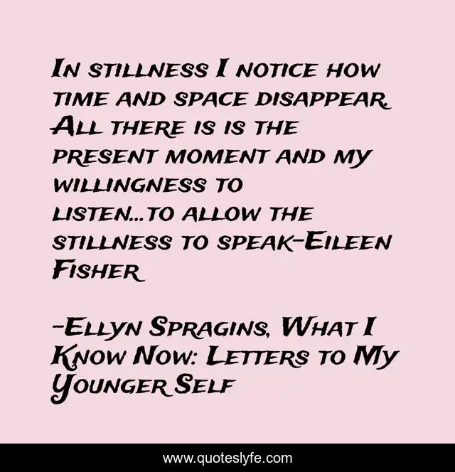 This page presents the quote "In stillness I notice how time and space disappear. All there is is the present moment and my willingness to listen...to allow the stillness to speak-Eileen Fisher". Author of this quote is Ellyn Spragins, What I Know Now: Letters to My Younger Self. .