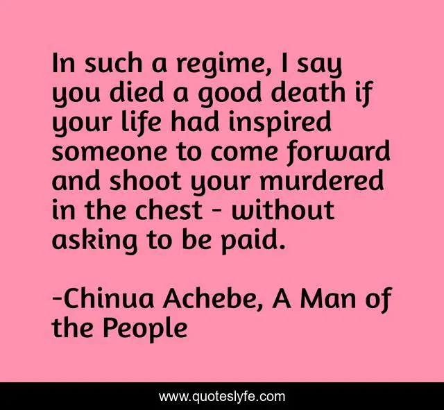 This page presents the quote "In such a regime, I say you died a good death if your life had inspired someone to come forward and shoot your murdered in the chest - without asking to be paid.". Author of this quote is Chinua Achebe, A Man of the People. This quote is about politics, nigeria, death, african-authors,.