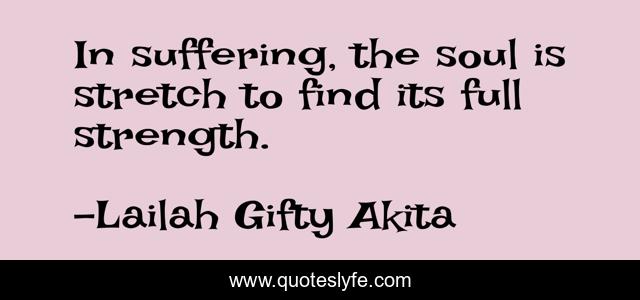 This page presents the quote "In suffering, the soul is stretch to find its full strength.". Author of this quote is Lailah Gifty Akita. This quote is about wisdom-of-lailah-gifty-akita, suffering, strength, soul, self-help,.
