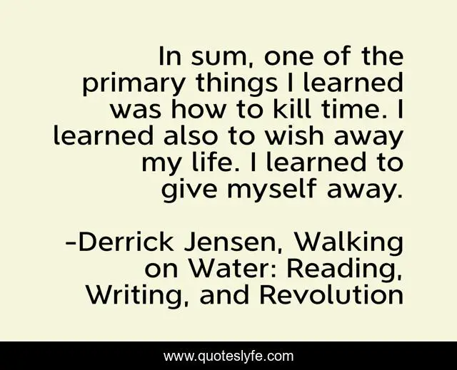 This page presents the quote "In sum, one of the primary things I learned was how to kill time. I learned also to wish away my life. I learned to give myself away.". Author of this quote is Derrick Jensen, Walking on Water: Reading, Writing, and Revolution. This quote is about classes, life-experience, schooling, time,.