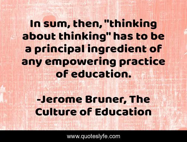 This page presents the quote "In sum, then, "thinking about thinking" has to be a principal ingredient of any empowering practice of education.". Author of this quote is Jerome Bruner, The Culture of Education. This quote is about thinking, education,.