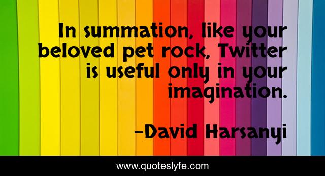 This page presents the quote "In summation, like your beloved pet rock, Twitter is useful only in your imagination.". Author of this quote is David Harsanyi. This quote is about imagination, like, rock,.