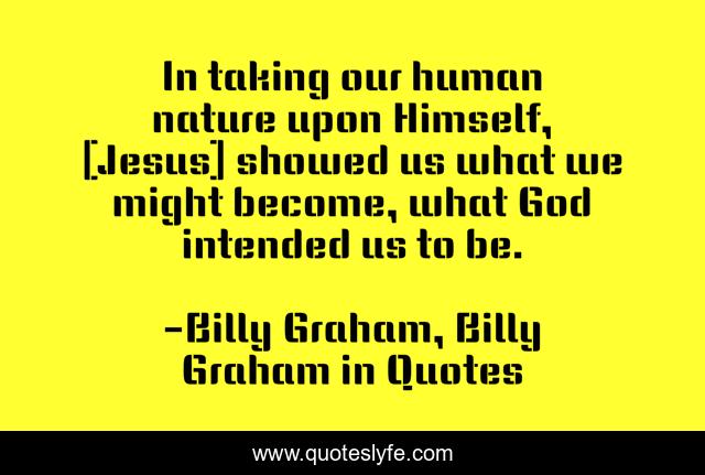 This page presents the quote "In taking our human nature upon Himself, [Jesus] showed us what we might become, what God intended us to be.". Author of this quote is Billy Graham, Billy Graham in Quotes. This quote is about human-nature, billy-graham,.