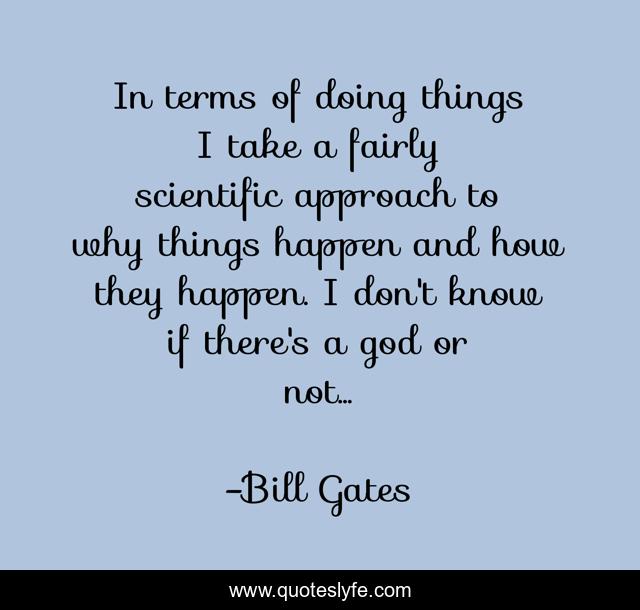 This page presents the quote "In terms of doing things I take a fairly scientific approach to why things happen and how they happen. I don't know if there's a god or not...". Author of this quote is Bill Gates. This quote is about science, agnosticism, belief, scientific, why,.