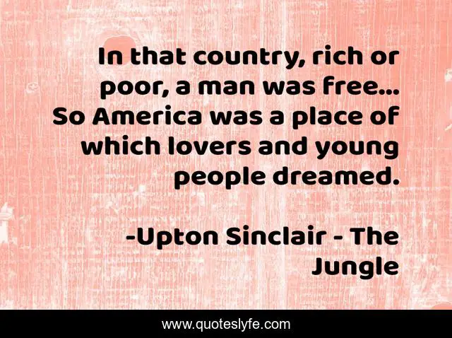 This page presents the quote "In that country, rich or poor, a man was free... So America was a place of which lovers and young people dreamed.". Author of this quote is Upton Sinclair - The Jungle. This quote is about dreams-love, america,.