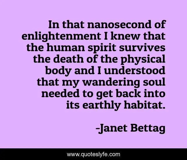 This page presents the quote "In that nanosecond of enlightenment I knew that the human spirit survives the death of the physical body and I understood that my wandering soul needed to get back into its earthly habitat.". Author of this quote is Janet Bettag. This quote is about brain-aneurysm, human-spirit, brain, inspirational, enthusiasm, near-death-experience, enlightenment,.
