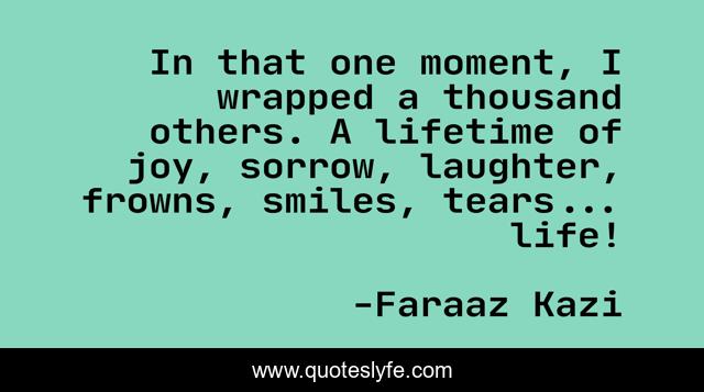 This page presents the quote "In that one moment, I wrapped a thousand others. A lifetime of joy, sorrow, laughter, frowns, smiles, tears... life!". Author of this quote is Faraaz Kazi. This quote is about romance, heartbreak, tragic, sad,.