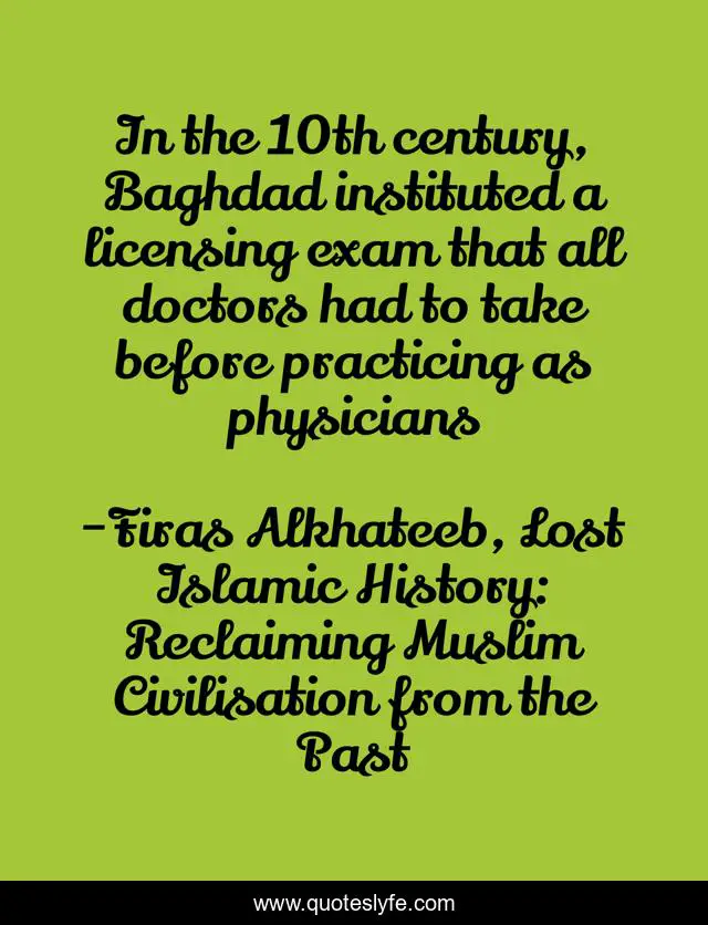 This page presents the quote "In the 10th century, Baghdad instituted a licensing exam that all doctors had to take before practicing as physicians". Author of this quote is Firas Alkhateeb, Lost Islamic History: Reclaiming Muslim Civilisation from the Past. This quote is about baghdad, iraq, history, muslims, islam,.