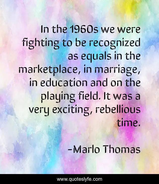 This page presents the quote "In the 1960s we were fighting to be recognized as equals in the marketplace, in marriage, in education and on the playing field. It was a very exciting, rebellious time.". Author of this quote is Marlo Thomas. This quote is about education, marriage, time,.