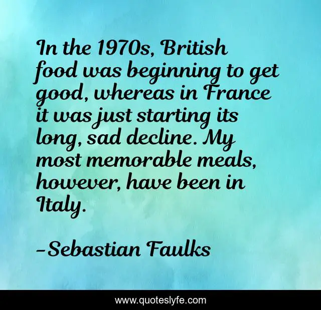 This page presents the quote "In the 1970s, British food was beginning to get good, whereas in France it was just starting its long, sad decline. My most memorable meals, however, have been in Italy.". Author of this quote is Sebastian Faulks. This quote is about food, good, beginning,.
