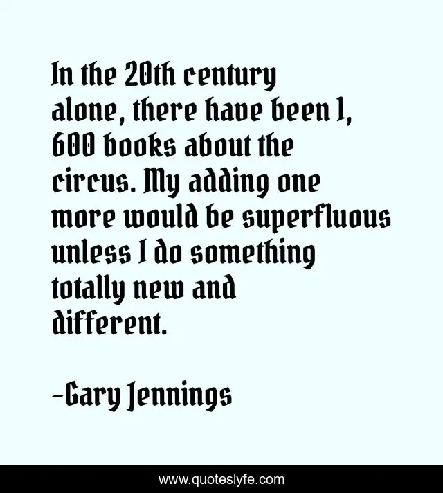 This page presents the quote "In the 20th century alone, there have been 1, 600 books about the circus. My adding one more would be superfluous unless I do something totally new and different.". Author of this quote is Gary Jennings. This quote is about new, different, circus,.