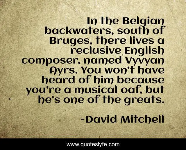 This page presents the quote "In the Belgian backwaters, south of Bruges, there lives a reclusive English composer, named Vyvyan Ayrs. You won’t have heard of him because you’re a musical oaf, but he’s one of the greats.". Author of this quote is David Mitchell. This quote is about funny, comedy, music, romantic,.