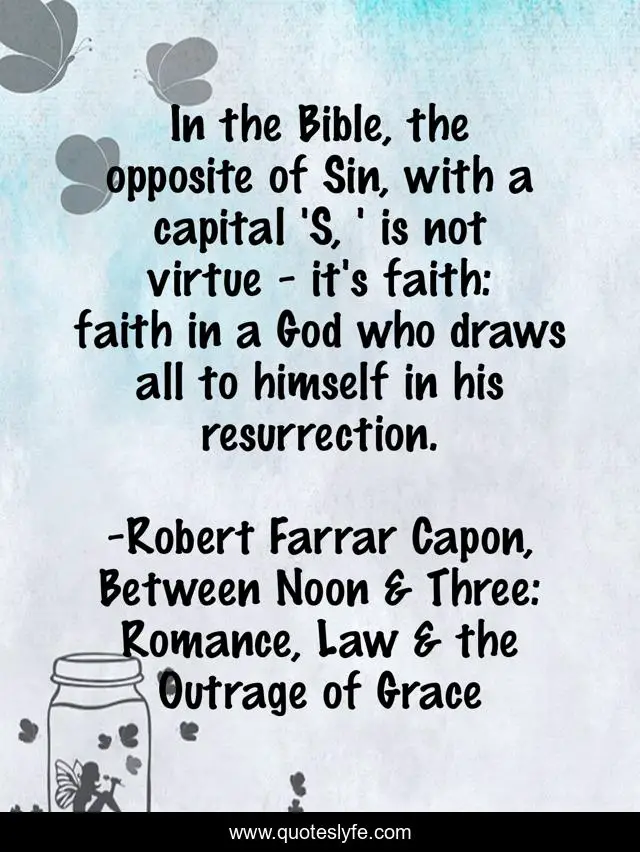 This page presents the quote "In the Bible, the opposite of Sin, with a capital 'S, ' is not virtue - it's faith: faith in a God who draws all to himself in his resurrection.". Author of this quote is Robert Farrar Capon, Between Noon & Three: Romance, Law & the Outrage of Grace. This quote is about god, faith, sin, virtue, jesus,.