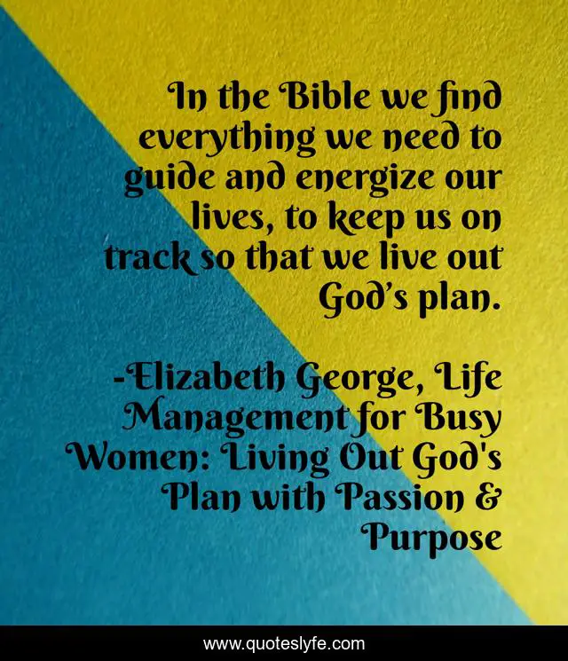 This page presents the quote "In the Bible we find everything we need to guide and energize our lives, to keep us on track so that we live out God’s plan.". Author of this quote is Elizabeth George, Life Management for Busy Women: Living Out God's Plan with Passion & Purpose. This quote is about bible, christian, energize, track, god, find, everything, live, lives,.
