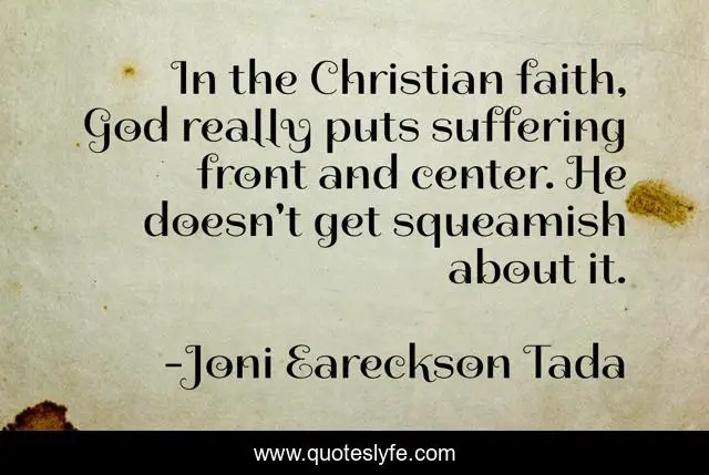 This page presents the quote "In the Christian faith, God really puts suffering front and center. He doesn't get squeamish about it.". Author of this quote is Joni Eareckson Tada. This quote is about god, suffering, christian,.
