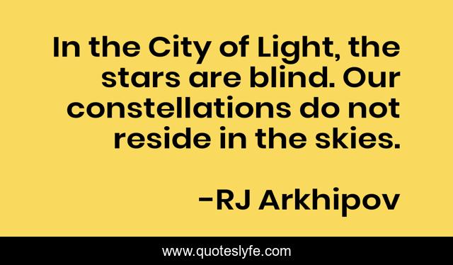 This page presents the quote "In the City of Light, the stars are blind. Our constellations do not reside in the skies.". Author of this quote is RJ Arkhipov. This quote is about blind, paris, constellations, stars, city-of-light, city-of-lights,.