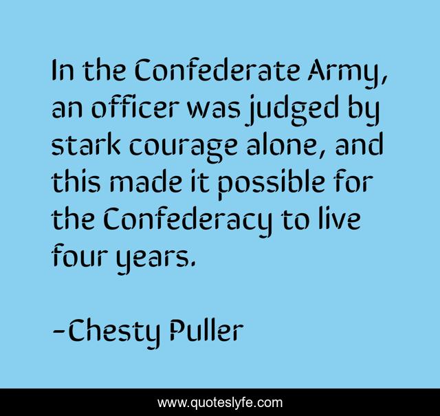 This page presents the quote "In the Confederate Army, an officer was judged by stark courage alone, and this made it possible for the Confederacy to live four years.". Author of this quote is Chesty Puller. This quote is about alone, live, courage,.